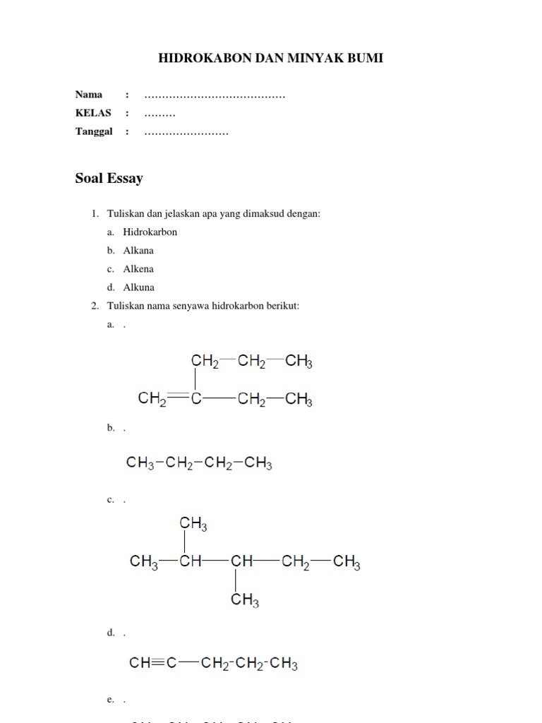 Soal essay senyawa hidrokarbon dan minyak bumi: Rangkuman materi disertai 30 contoh soal hidrokarbon kelas 11 dan jawaban berikut video pembelajaran dan rangkuman, contoh soal senyawa hidrokarbon pembahasan & jawaban. Soal ph essay nomor 2: Hydrocarbon, any of a class of organic chemical compounds composed only of the elements carbon and hydrogen. Hydrocarbons are the principal constituents of petroleum and natural gas and serve as.